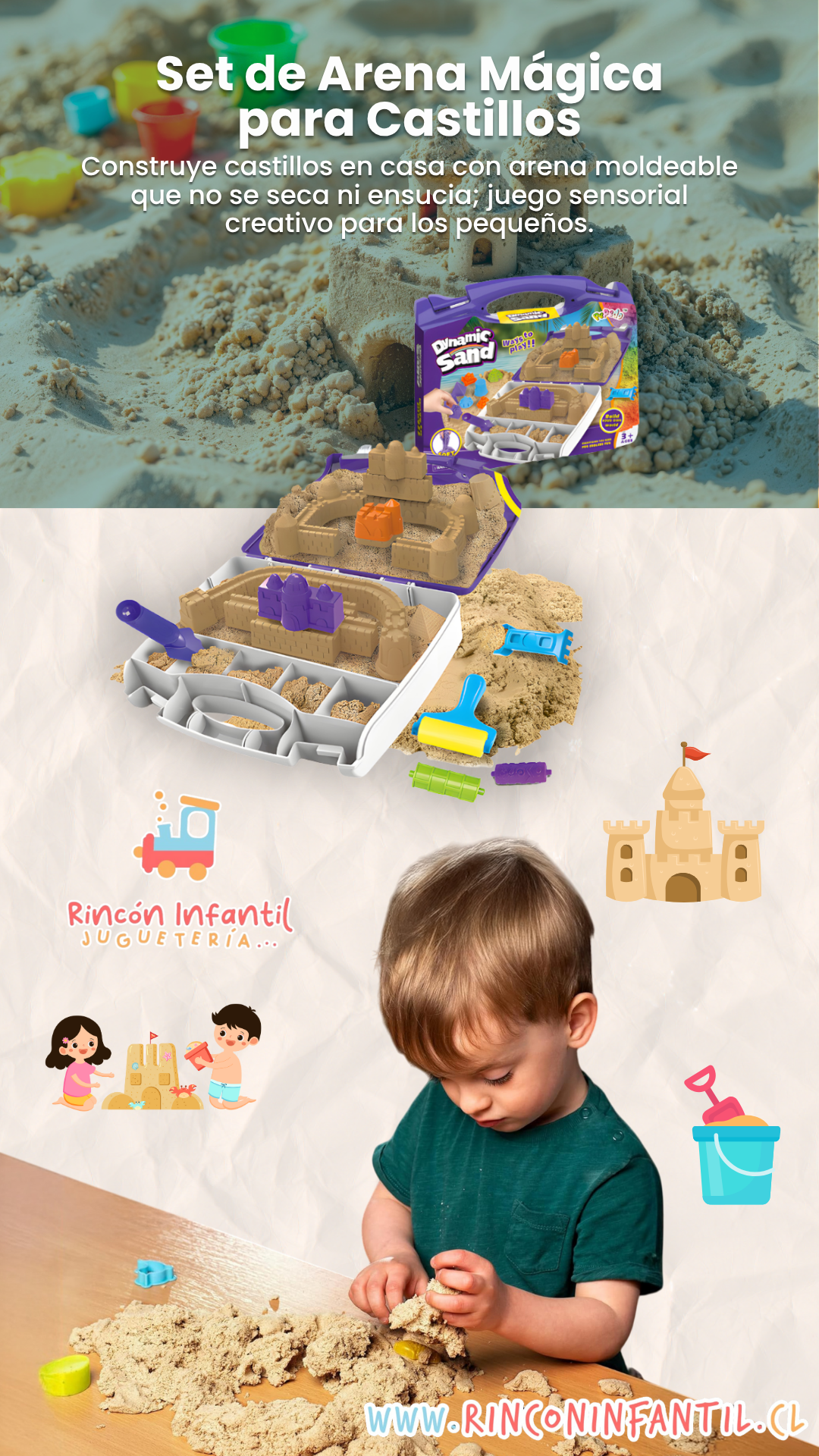 | Incluye | 750 g de arena mágica aprox., moldes variados para castillos, herramientas de juego, bandeja organizadora |